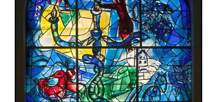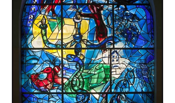 יעקב אומר על דן " יְהִי-דָן נָחָשׁ עֲלֵי-דֶרֶךְ שְׁפִיפֹן עֲלֵי-אֹרַח". " דָּן יָדִין עַמּוֹ כְּאַחַד, שִׁבְטֵי יִשְׂרָאֵל", אומר התנ"ך. השם דן בא מהמילה העברית לשיפוט, והסמלים מתייחסים לנושא הזה. המנורה בנויה כמו מאזני הצדק. חרב המלך שלמה בחלק העליון, מתייחסת לסיפורן של שתי הנשים שטענו כי הן אמהות לאותו ילד. בגלל אהבתו של שאגאל למשפט המקראי ולציווי לשפוט בצדק, הוא מציב בחלון זה תמונה של בית ילדותו בוויטבסק, רוסיה, בלבן.