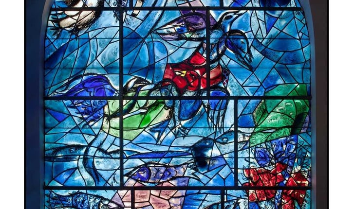 בנו הבכור של יעקב. לציפור שבמרכז יש טפרי נשר המייצגים את כוחו של הבכור. "פַּחַז כַּמַּיִם" אמר יעקב לראובן, ומכאן כחול הים והשמים בחלון. הדגים שאנו רואים בחלון זה חוזרים על עצמם פעמים אחדות בחלונות אחרים. הם סמל לעושר ולפריון. בצד הימני התחתון, חפשו את פרח הדודאים שראובן הביא לאמו האהובה לאה.