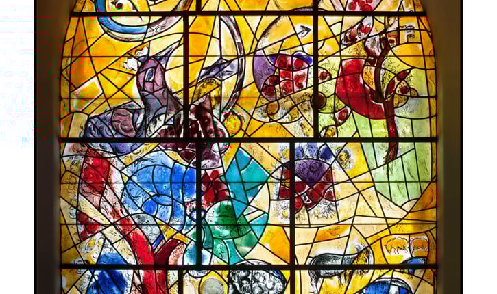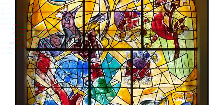 בנו האהוב של יעקב, הבן הבכור מאשתו האהובה רחל, יוסף ידוע כבעל החלומות. הוא מפרש את החלומות של פרעה המצרי, שראה בחלומו שבע פרות שמנות ושבע פרות רזות, ואת שבעת השיבולים היפות ושבעת השיבולים השדופות – אשר יוסף פירש לשבע שנים טובות ושבע שנות רעב. צבע החלון הזהוב מזכיר את הזהב של החיטה, שחרוט בצורה מבריקה לתוך הרקע של החלון. שימו לב בחלק העליון של החלון לידיים שאינן שלמות ומוכתמות בדם – התייחסותו של שאגאל לשואה וששת מיליון הנספים. הידיים מחזיקות בשופר, וקולו מעיר אותנו ומבשר אל הגאולה. שאגאל ידע שקול הגאולה לא נשמעה בשואה.