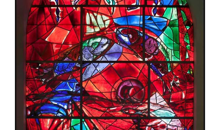 שימו לב לשקיעה על הים. שבט ימי זה היה מורכב מדייגים ומסוחרים. שבט זבולון חי לאורך הגבול הצפוני, פניציה העתיקה, הנמצאת כיום בחוף לבנון. הסתכלו על הסירה – זוהי דוגמה טובה של כישרונו של שאגאל ביצירת תמונות תלת מימדיות בזכוכית שברירית. שני הדגים השמנים העטורים באבני חן בחלק העליון של החלון משקפים את עושרו והצלחתו של זבולון במסחר.