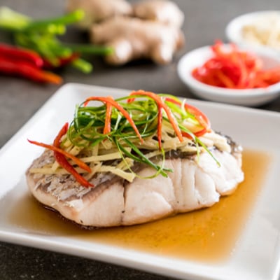 דג מוסר מאודה עם ירקות גינה בנוסח אסייתי על מצע קינואה