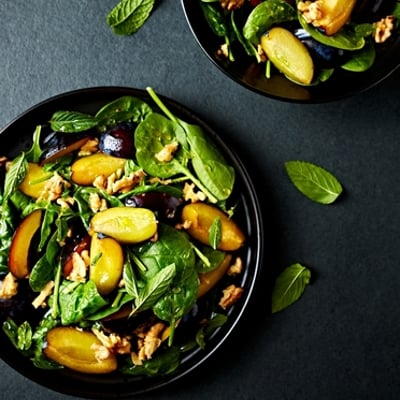 סלט עלים ירוקים ושזיף