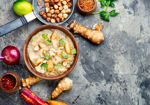 - מטגנים הבצל עם 2 כפות שמן זית, מוסיפים ירקות שורש קצוצים, מקפיצים עד להזהבה.