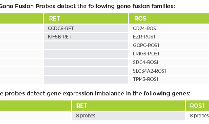 בחלק העליון של הטבלה המצורפת שלהלן מופיעה רשימת הגנים שעוברים איחוי באופן ספציפי עם ALK, RET, ROS ו- NTRK (השיטה השניה). בחלק התחתון של הטבלה מופיעים מספר הפרובים שתוכננו עבור כל גן לשיטה הלא ספציפית (הראשונה).