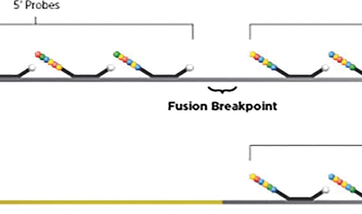 - השיטה השנייה בודקת באופן ספציפי איחוי של ארבעת הגנים עם מספר גנים נפוצים. הספציפיות מתקבלת כתוצאה מהוספת פרוב שנקרא Protector Probe לפרוב שמכוון לנקודות איחוי ספציפיות ( איור מס' 2 ). ה- Protector Probe יוצר שיווי משקל תרמודינאמי שמאפשר קישור מושלם לאתר האיחוי רק במצב של Fusion ורק במקרה כזה יתקבל סיגנל פלורוסנטי.