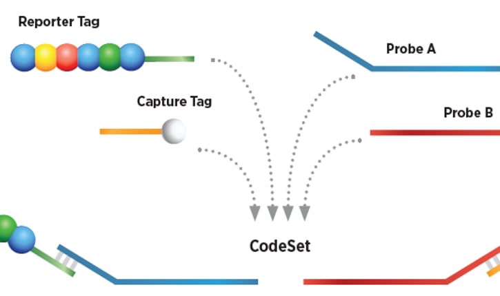 באיור 1 מתוארים הפרובים השונים אותם מוסיפים ל RNA לצורך הבדיקה. ישנם 3 פרובים המכונים CodeSet: A, B ו- P. פרוב A נקשר ל- RNA ומכסה את הרצף של אזור האיחוי. פרוב B נקשר ל- RNA ברצף שנמצא 3' לאזור הקשירה של פרוב A. פרוב P (Protector) נקשר לפרוב A כאשר פרוב A אינו קשור ל RNA על מנת להגביר את הספציפיות. פרוב Reporter מחובר לרצף ייחודי של מולקולות פלורוסנטיות והוא ספציפי לרצף מסוים של איחוי. פרוב ה Reporter מתחבר באמצעות רצף ספציפי לפרוב A. לפרוב B מתחבר גם tag של Biotin על מנת לאפשר היצמדות של כל הקומפלקס (RNA ופרובים) למשטח של ה cartridge המצופה ב streptavidin.