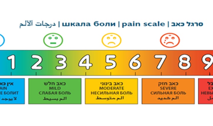 - ניתן לדרג את עצמת הכאב באמצעות מספר בין 0-10 ( 0 לא כואב כלל, 1-3 כאב קל, 4-6 כאב בינוני, 7-10 כאב חזק) או בתיאור מילולי: לא כואב בכלל, כאב קל ,כאב בינוני, כאב חזק או בלתי נסבל