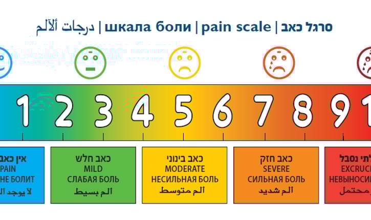 ניתן לדווח לצוות על עוצמת הכאב שלך באמצעות מספר בין 0-10 (0 לא כואב כלל, 10 כאב בלתי נסבל), או בתיאור מילולי: לא כואב בכלל, כאב קל ,כאב בינוני, כאב חזק או בלתי נסבל. בנוסף, ישאל אותך הצוות המטפל באופן יזום האם יש לך כאב וכמה הוא מפריע לתפקוד ולרווחה שלך.